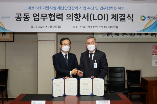 [충청뉴스큐] 세종특별자치시시설관리공단은 9일 한국전자통신연구원과 스마트 사회기반시설 안전관리 기술개발을 위한 협약을 체결했다고 밝혔다.