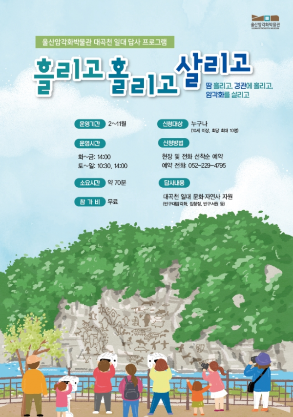 [충청뉴스큐] 울산암각화박물관은 반구대 암각화가 자리한 대곡천 일대의 문화·자연사 자원을 살펴보는 답사 프로그램인 ‘흘리고 홀리고 살리고’를 2월 15일부터 11월까지 운영한다고 밝혔다.