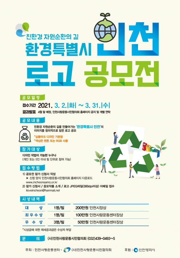 이번 공모전은 인천시가 올해 중점적으로 추진 중인 친환경 자원순환 운동을 함축적이고 창의적으로 디자인한 로고를 선정하기 위해 마련되었는데, 향후 선정된 작품은 자원순환운동 정책과 관련한 각종 사업에 지속적으로 활용될 예정이다.