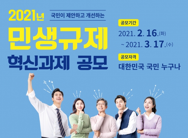 공모 분야는 국민복지 일상생활 취업·일자리 소상공인 및 중소기업 지원 신산업 등 5개 분야로 시민생활과 지역경제 활동 전반을 아우르는 규제가 포함되며 복수 분야에 응모도 가능하다.