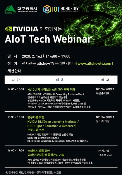 [충청뉴스큐] 대구시는 인공지능, 사물인터넷, 스마트시티 분야의 최신 기술 동향을 지역에 공유하고 신기술 개발 및 기업성장을 촉진하기 위해 16일 ‘엔비디아와 함께 하는 AIoT Tech Webinar’를 개최한다.