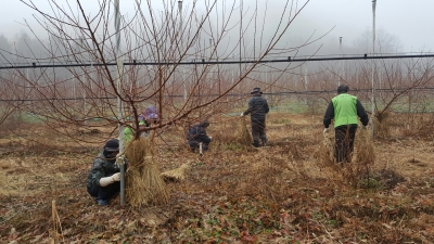 생산적 일손 긴급지원반은 지난 26일 농가주가 경운기 사고로 인한 발목 인대 파열로 농사에 어려움을 겪고 있는 불정면 앵천리 소재 한 사과농가를 찾아가 겨울철 동파방지를 위한 볏짚씌우기 작업에 나서며 구슬땀을 흘렸다.