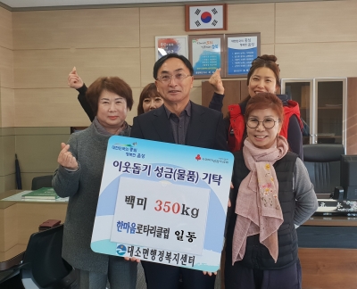 [충청뉴스큐] 대소 한마음로타리클럽이 지난 26일 어려운 이웃에 전해달라며 대소면 행정복지센터에 백미 350kg을 기탁했다.