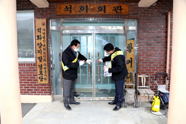16일 사전준비 방역을 위해 김재종 옥천군수는 동이면 석화 양지말 경로당을 방문해 직접 방역에 참여했다.
