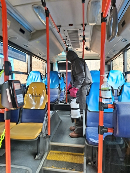 이에 시는 시내버스 안에서 코로나19 바이러스 감염 사례가 발생하지 않도록 발 빠르게 전문방역업체를 활용, 시내버스가 기·종점지에 도착할 때마다 손잡이, 의자 표면 닦기 및 분무소독 등을 철저히 했다.