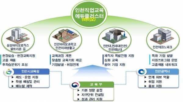 바이오 에듀클러스터는 인천광역시 일자리경제본부 미래산업과의 바이오인력양성사업과 연계해 ‘직업계고 학생 선발 → 바이오공정 학점 이수 → 취업확정 → 조기취업형 계약학과 → 지역사회의 바이오 인재 정착’ 로드맵을 통해 성장을 지원한다.