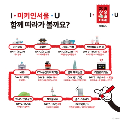 미키 마우스의 ‘서울투어’ 일정은 ‘아이서울유’ 공식 페이스북과 월트디즈니 컴퍼니 코리아 공식 페이스북을 통해 확인할 수 있다.