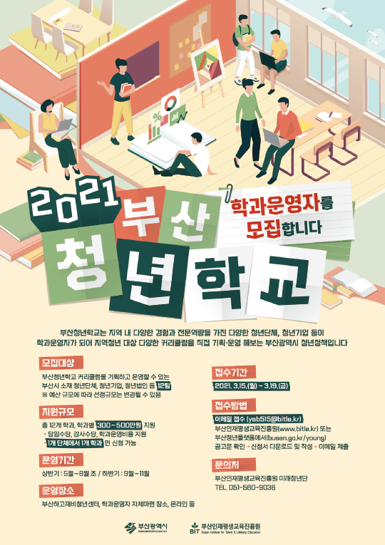 참여를 희망하는 학과운영자는 만 39세 이하 청년으로 구성된 부산시 소재 청년단체, 청년기업, 청년법인이면 누구나 신청 가능하며 오는 3월 15일부터 19일까지 부산인재평생교육진흥원 또는 부산청년플랫폼에서 공고문을 확인 후 이메일을 통해 접수하면 된다.
