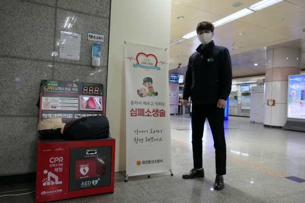 둔산소방서는 코로나19 확산으로 시민을 대상으로 하는 안전교육이 어려워짐에 따라 혼자 스스로 보고 체험할 수 있도록 작년 5월부터 대전 시청역에 CPR체험대를 설치해 운영하고 있다.