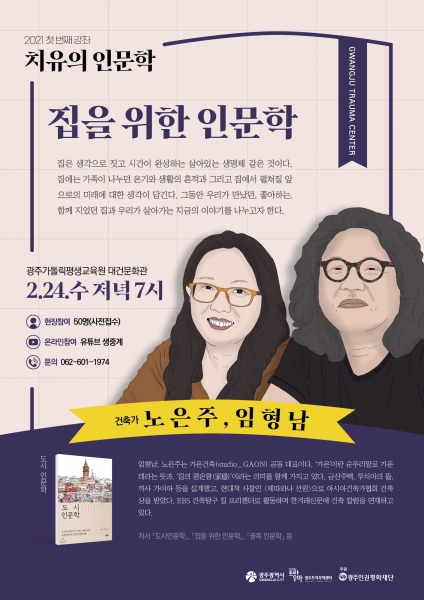올해 첫 강연은 24일 오후 7시 광주가톨릭평생교육원 대건문화관에서 노은주, 임형남 건축가가 ‘집을 위한 인문학’을 주제로 진행한다.
