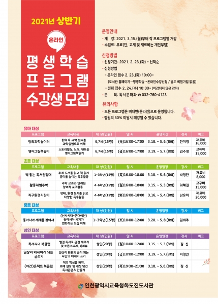 [충청뉴스큐] 인천시교육청화도진도서관은 23일부터 지역주민의 자기 계발을 위해 ‘2021년 상반기 온라인 평생학습프로그램’ 수강생을 모집한다.