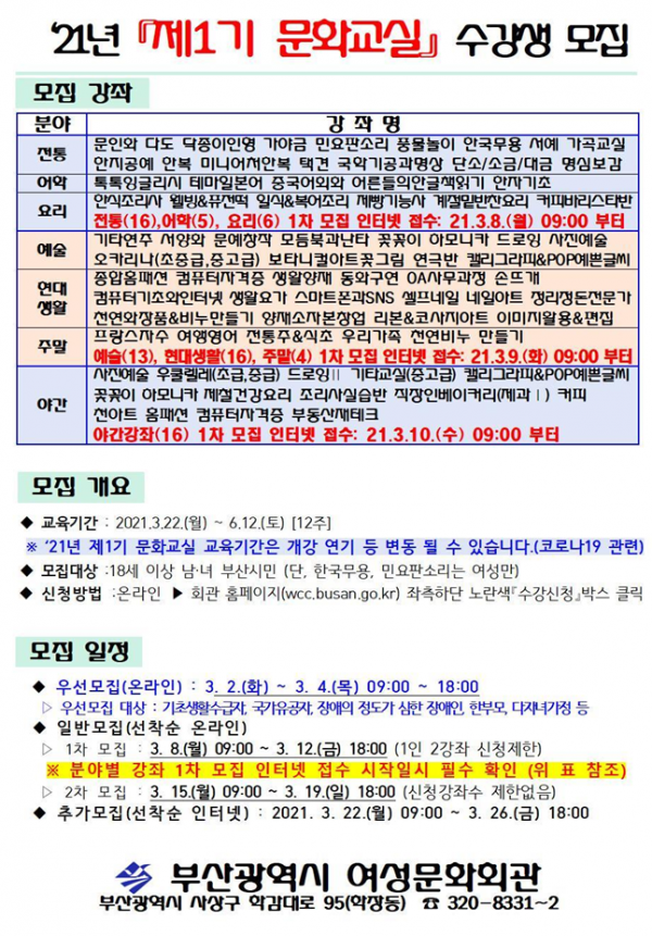 [충청뉴스큐] 부산시 여성문화회관은 시민들의 다양하고 전문적인 능력을 개발 및 삶의 질 향상을 돕기 위해 ‘2021년 제1기 문화교실’ 수강생을 모집한다고 밝혔다.