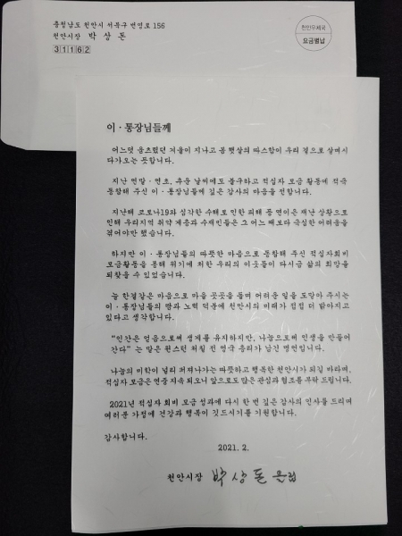 박상돈 천안시장은 서한문에서 “천안시는 지난해 코로나19와 심각한 수해 등 연이은 재난상황으로 취약계층과 수재민들은 그 어느 때보다 극심한 어려움을 겪어야만 했다”며 “이통장님들께서 적극 동참해주신 모금활동을 통해 우리의 이웃들이 다시금 삶의 희망을 되찾을 수 있었다”고 전했다.