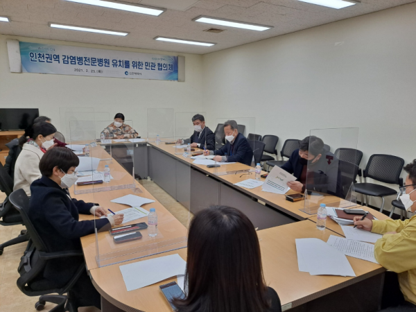 [충청뉴스큐] 인천광역시는 2월 25일 인천시의회 세미나실에서‘인천권역 감염병 전문병원 유치를 위한 민관협의체’회의를 열고 감염병 전문병원 유치 추진 경과, 공모 참여 의료기관에 대한 지원방안 등을 논의했다고 밝혔다.