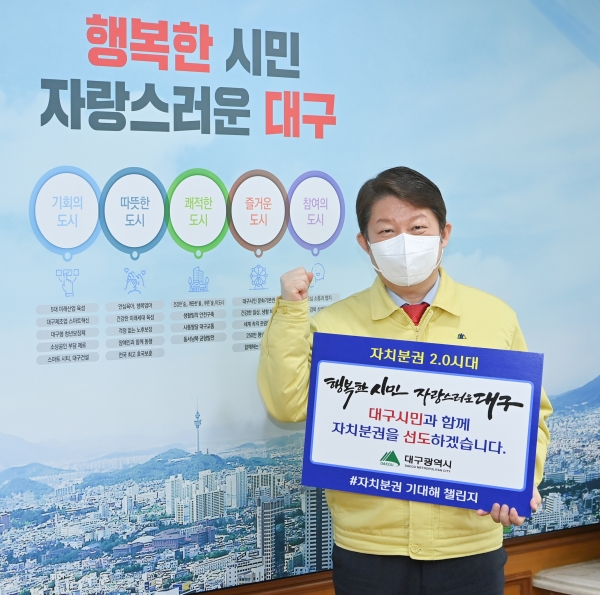 [충청뉴스큐] 권영진 대구시장은 26일 주민 중심의 실질적인 자치분권 실현에 대한 적극적인 관심을 갖고 ‘자치분권 기대해’ 챌린지에 동참했다.