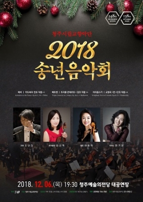 [충청뉴스큐] 청주시립교향악단은 제148회 정기연주회‘2018 송년음악회’를 오는 12월 6일 저녁 7시30분 청주예술의전당 대공연장에서 선보인다. 2018년 대미를 장식하는‘2018 송년음악회’는 조규진 지휘자를 객원지휘자로 초청해 바이올린과 첼로 피아노 협연 등 클래식 명곡들과 함께 소외계층을 초청하여 따뜻한 송년의 밤을 구성한다.