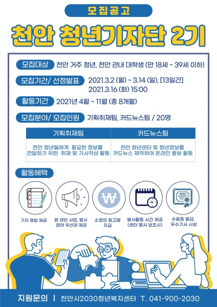 [충청뉴스큐] 천안시2030청년복지센터는 오는 14일까지 관내 청년을 대상으로 ‘천안청년기자단 2기’를 모집한다고 밝혔다.