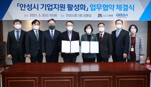 [충청뉴스큐] 안성시는 3일 안성시청 상황실에서 김보라 안성시장과 유승경 경기도경제과학진흥원장이 참석한 가운데 ‘안성시와 기업지원 활성화를 위한 업무협약’을 체결했다.
