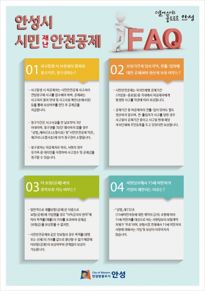 올해 시민안전공제 가입기간은 2021년 2월 1일부터 2022년 1월 31일까지 1년간이며 피공제자는 안성시에 주민등록을 두고 거주하는 모든 시민으로 전국 어느 곳에서 사고를 당해도 타 보험 가입여부와 관계없이 중복 보장을 받을 수 있다.