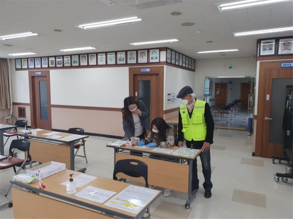 매일 1~2명의 자원봉사자가 코로나19 확산방지를 위한 발열 검사를 실시하고 청북읍행정복지센터를 방문하는 어르신이 손쉽게 경기도 재난기본소득을 신청할 수 있도록 신청서 작성을 도와드리고 있다.