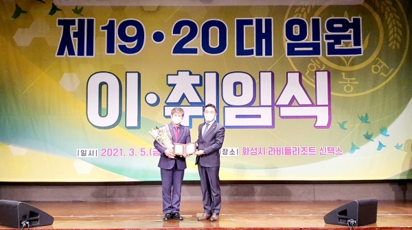 [충청뉴스큐] 경기도의회 진용복 부의장은 5일 화성 라비돌리조트 신텍스에서 코로나19 방역대책을 준수한 채 열린 ‘한국농업경영인경기도연합회 제19·20대 임원 이·취임식’에 참석해 축하했다.