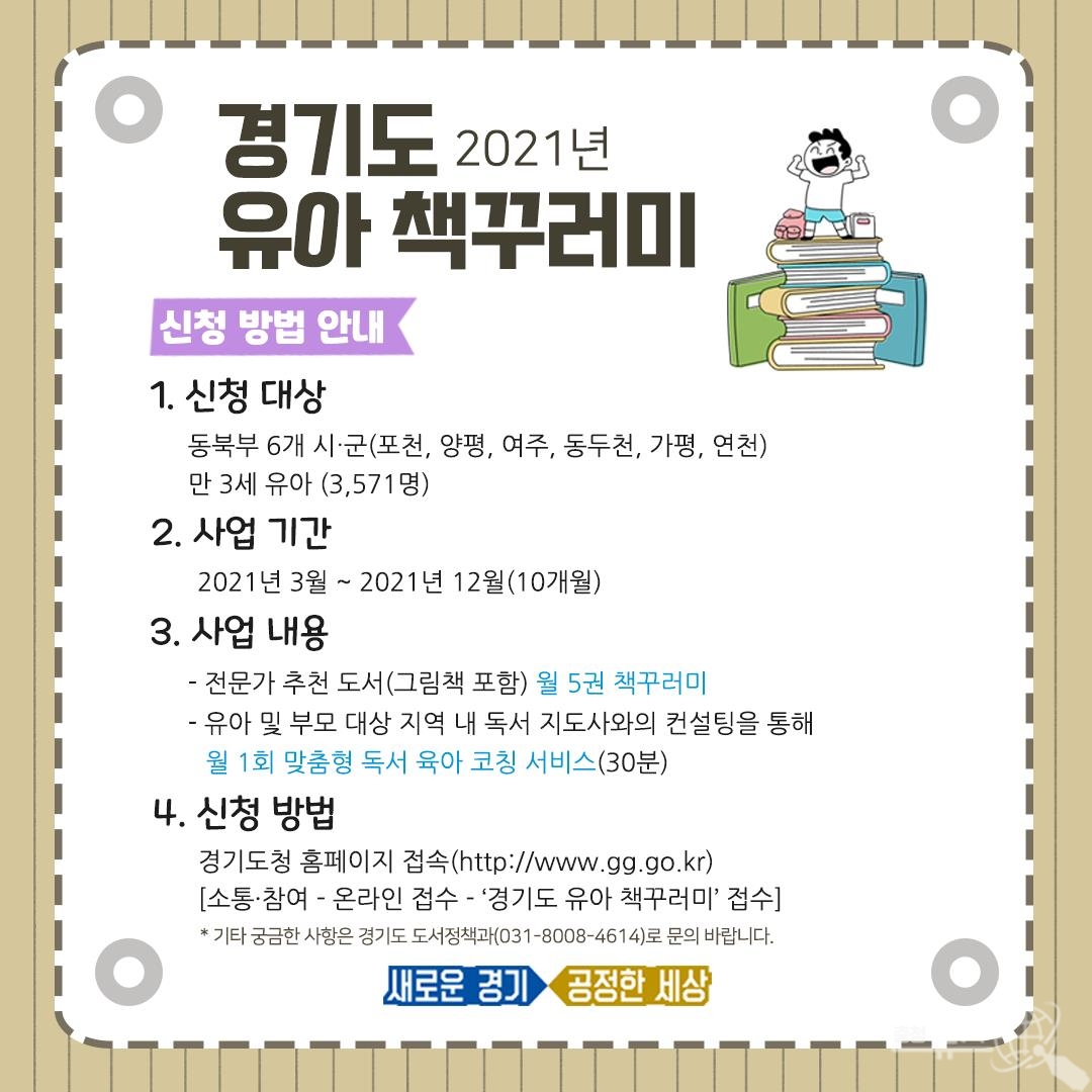 7일 경기도에 따르면 도는 포천, 양평, 여주, 동두천, 가평, 연천 등 경기 동북부 지역 6개 시군을 대상으로 이달 15일부터 이런 내용을 담은 ‘유아 책꾸러미’ 사업을 시행하기로 하고 경기도 홈페이지를 통해 신청자 모집에 들어갔다“고 밝혔다.
