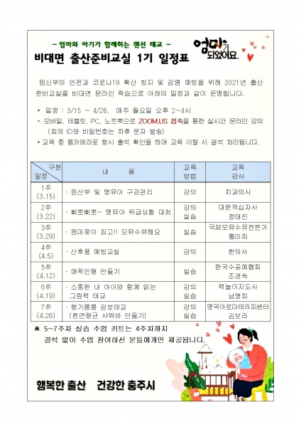 이번 출산준비교실은 코로나19에 대응해 기존의 대면 교육을 클라우드 기반 화상회의 프로그램 줌 접속을 통한 비대면 교육으로 전환해 진행된다비대면 출산준비교실은 연 3회 운영되며 1기는 오는 3월 15일부터 7주간 매주 월요일 오후 2시에 진행된다.