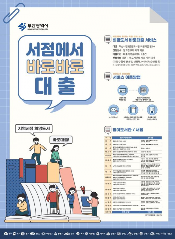 [충청뉴스큐] 부산시는 3월부터 ‘부산시 지역서점 희망도서 바로대출’서비스를 전면 시행한다고 밝혔다.