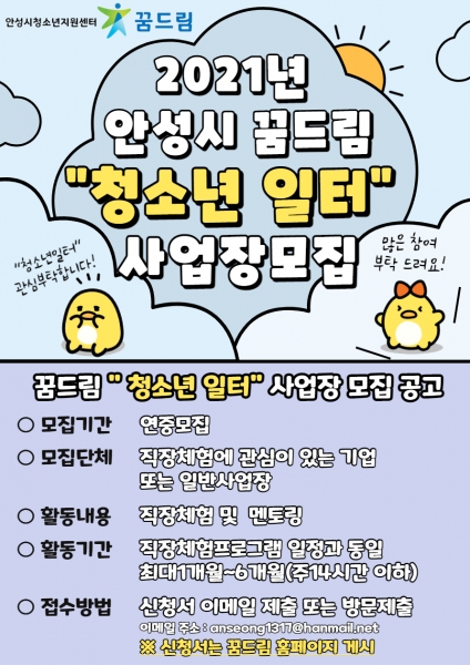 [충청뉴스큐] 안성시학교밖청소년지원센터 꿈드림은 2021년도 ‘직장체험프로그램’ 협력사업장인 ‘꿈드림 청소년 일터’를 연중 모집한다고 밝혔다.