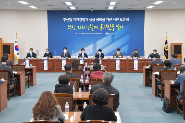 [충청뉴스큐] 부산시는 지난 9일 시의회 대회의실에서 오는 7월 자치경찰제 전면시행을 앞두고 자치경찰제의 효율적인 준비와 안정적인 시행을 위한 ‘부산형 자치경찰제 성공 정착을 위한 시민 토론회’를 개최했다.