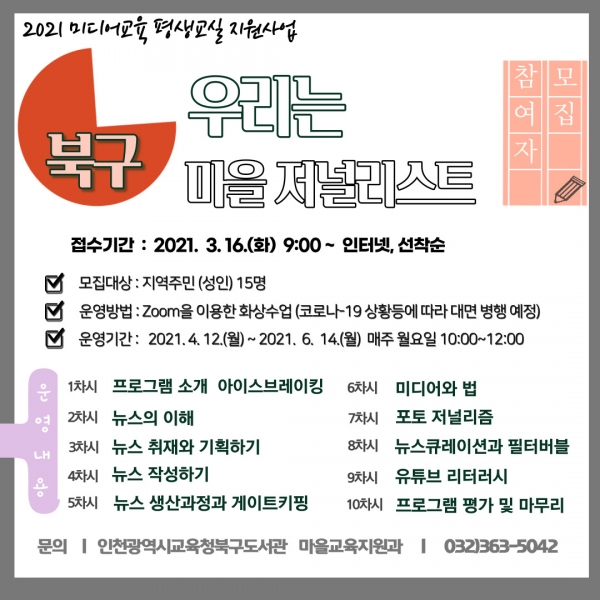 [충청뉴스큐] 인천시교육청북구도서관은 한국언론진흥재단의 2021 미디어교육 평생교실 지원사업 공모에 선정돼 오는 4월부터 ‘우리는 마을 저널리스트’ 과정을 운영한다고 밝혔다.