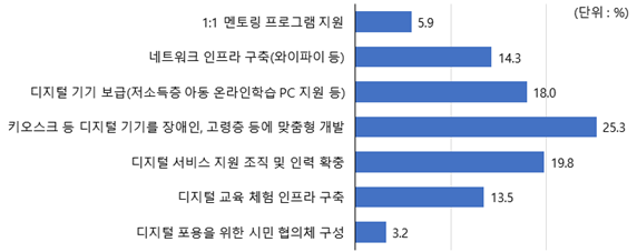 응답자 25.3%는 디지털 소외 예방을 위해 가장 필요한 정책지원으로 ‘디지털 기기의 취약계층 맞춤형 개발’을 꼽았으며 다음으로 ‘디지털 서비스 이용 시 지원 조직과 인력 지원’, ‘디지털 기기 보급’ 등이라고 응답했다.