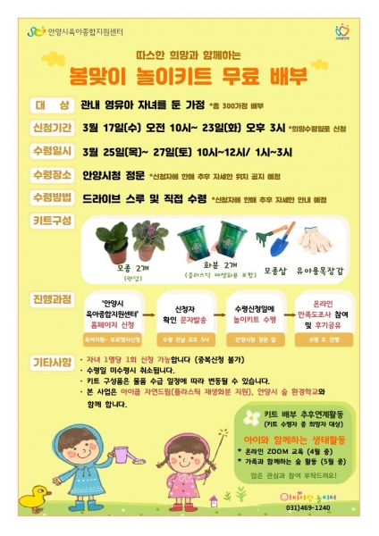 [충청뉴스큐] 안양시가 집안에서 재배의 성취감을 맛볼 수 있는 봄맞이 놀이키트를 무료 배부한다고 8일 밝혔다.