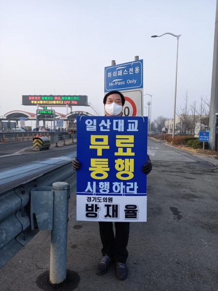 [충청뉴스큐] 방재율 경기도의회 보건복지위원장은 11일 오전 7시 30분부터 9시까지 일산대교에서 다리 통행료 무료화를 촉구하는 1인 시위를 가졌다.