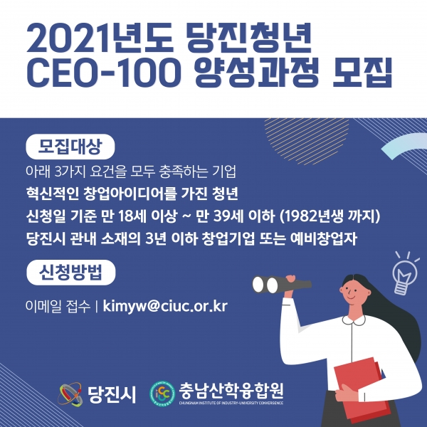 [충청뉴스큐] 당진시는 이번 달 19일까지 관내 3년 이하 창업기업 또는 예비창업자를 대상으로 ‘당진청년 CEO-100양성과정’ 참여자를 모집한다.