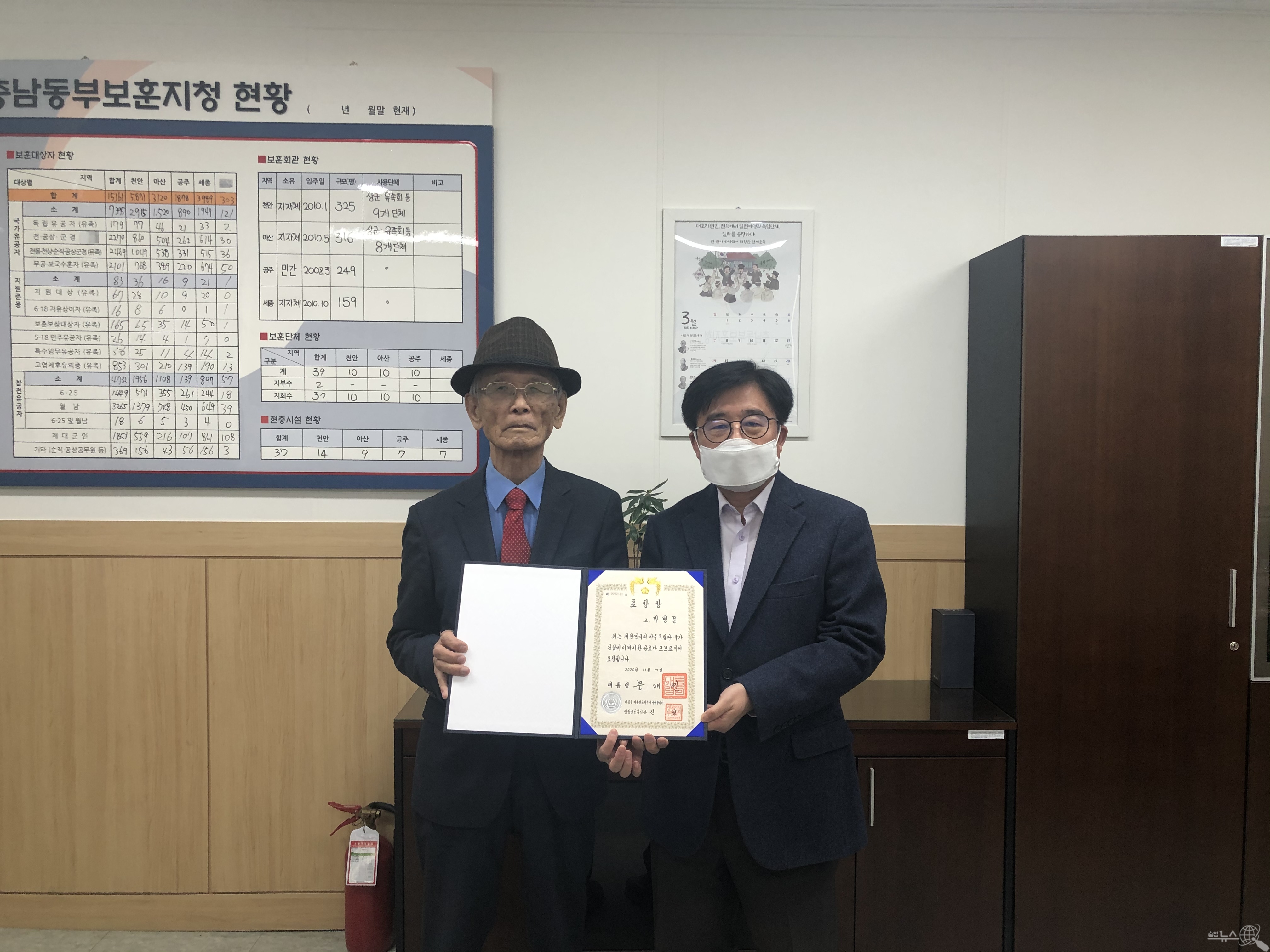 천안동부보훈지청(지청장 임규호)은 12일 오후2시 지청 3층 지청장실에서 독립유공자 故 박병문지사 후손에게 대통령 표창을 전수했다“고 밝혔다. 표창은 외손자 권용환씨가 전수받았다.
