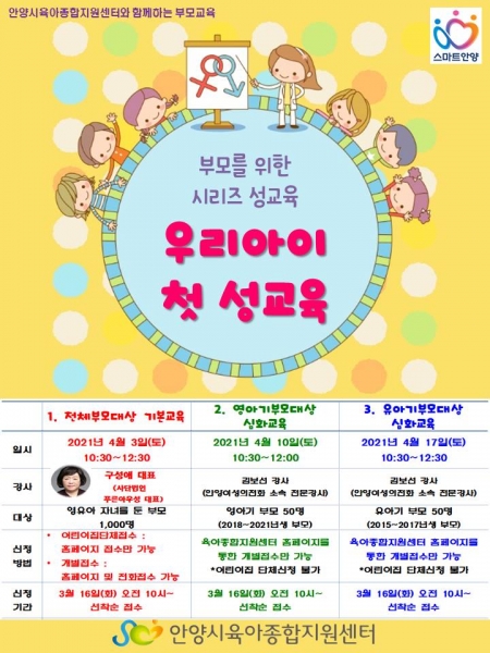 ‘우리아이 첫 성교육’이란 테마로 실시되는 이번 성교육은 4월 3일 구성애 푸른아우성 대표의 강연에 이어 김보선 안양여성의전화 소속 전문강사가 10일과 17일 두 번에 걸쳐 교육을 진행한다.