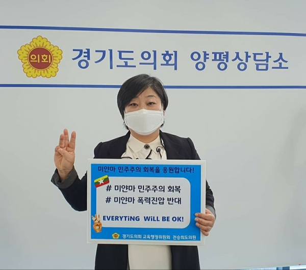 [충청뉴스큐] 경기도의회 교육행정위원회 전승희 의원이 지난 11일 경기도의회 양평상담소에서 미얀마 군부 쿠데타와 국민 폭압을 강력히 규탄하고 미얀마 국민의 민주화 노력을 지지하기 위한‘미얀마 민주주의 회복 응원 챌린지’에 동참했다.
