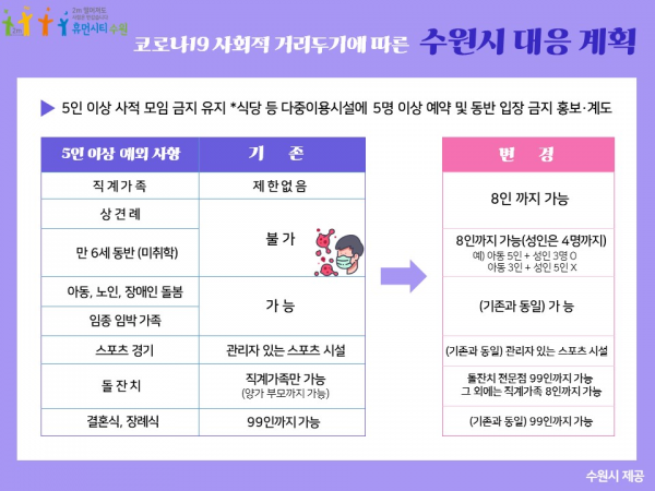 복지시설 이용 인원은 ‘정원의 50% 이하’로 제한하고 실내·외 공공 체육시설은 이용정원의 30% 내에서 수원시민만 이용할 수 있다.