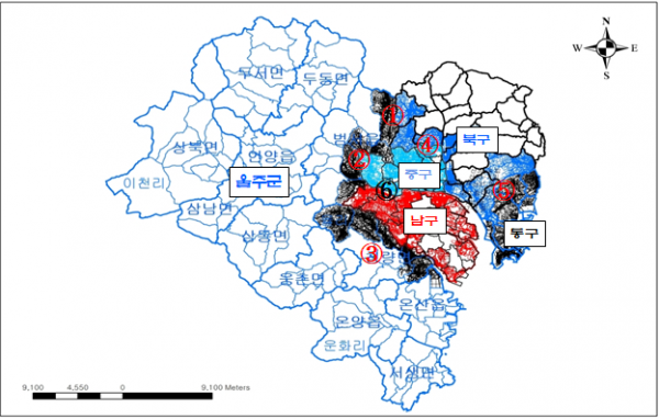 울산시는 이중 경계 지역에 대해 구·군간 지적도를 중첩시켜 경계의 접합 정도를 확인 후 항공·위성사진 등을 토대로 가장 합리적인 경계를 도출했고 이를 구·군간 협의를 거쳐 지적공부 상의 행정구역 경계를 정비했다.