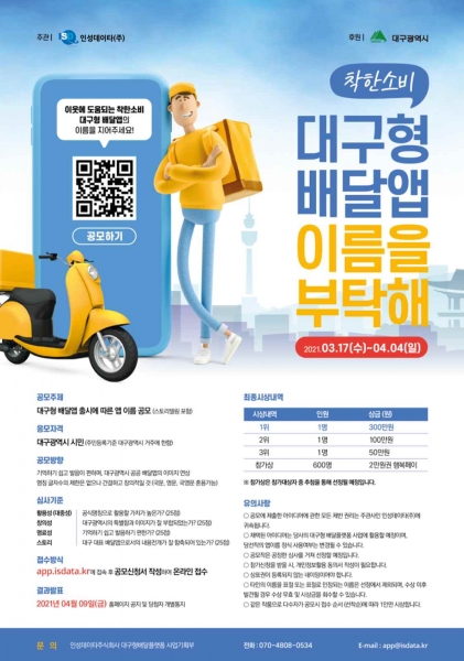 관련 문의는 인성데이타 대구형 배달플랫폼 사업기획부 전화 또는 메일로 문의인성데이타는 많은 시민들의 참여를 독려하기 위해 제안된 이름에 대해 활용성, 창의성, 명료성, 스토리에 대한 공정한 심사를 통해 1위에게는 300만원 2위에게는 100만원 3위에게는 50만원의 상금을 지급하고 참가자 중 600명을 추첨해 지역사랑상품권 2만원을 참가상으로 시상할 예정이다.