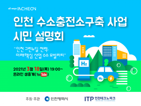 [충청뉴스큐] 인천광역시는 인천시 수소충전소 구축사업 시민설명회를 18일 저녁 6시 55분부터 인천시 유튜브 채널에서 생방송으로 개최한다고 밝혔다.