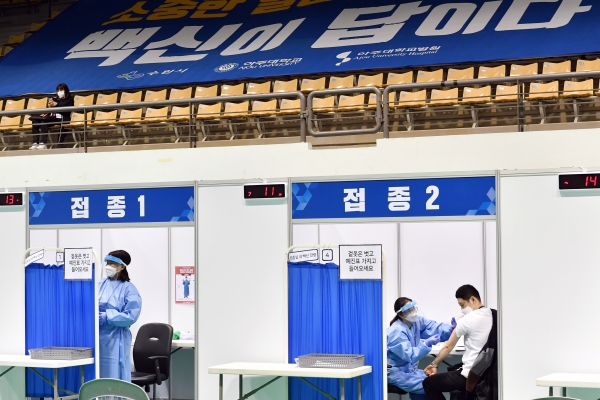 [충청뉴스큐] ‘수원1호 예방접종센터’가 설치된 아주대 체육관에서 17일 실제 예방접종 상황을 가정한 모의 훈련이 진행됐다.