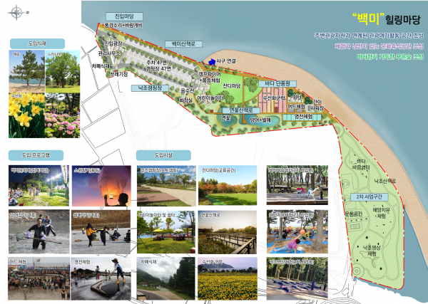 백미힐링마당은 오는 11월까지 총 25억원이 투입돼 19,239㎡ 규모로 47면의 오토캠핑장 머드 및 염전 체험장 어린이 놀이터 잔디마당 연꽃 산책로 등을 갖출 예정이다.