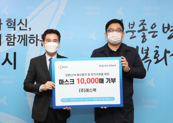 [충청뉴스큐] 화성시는 마스크 제조업체인 ㈜레스텍이 코로나19로 어려움을 겪고있는 화성시민들을 위해 사용해 달라며 마스크 1만매를 기부했다고 밝혔다.