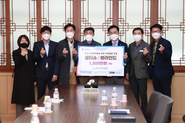 [충청뉴스큐] 평택시 사회적기업협의회는 지난 16일 평택시청 대외협력실에서 저소득가구 및 취약계층을 대상으로 블라인드 30가구 설치, 물티슈 120박스를 기탁했다.