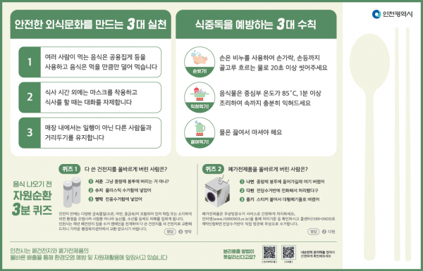 [충청뉴스큐] 인천광역시는 일반음식점 및 휴게음식점 등 덜어먹기 실천업소를 대상으로“안전한 외식문화 3대 실천과제”, “식중독 예방 3대 수칙”의 문구가 새겨진 홍보 식탁지를 제작해 배부한다고 밝혔다.