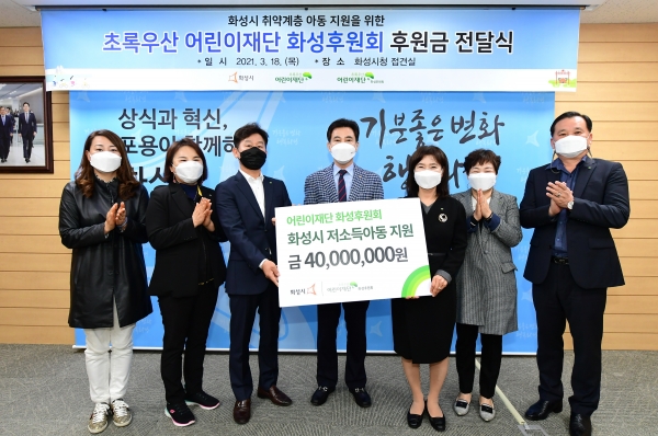 [충청뉴스큐] 화성시가 18일 시청에서 초록우산 어린이재단 화성후원회와 후원금 전달식을 가졌다.
