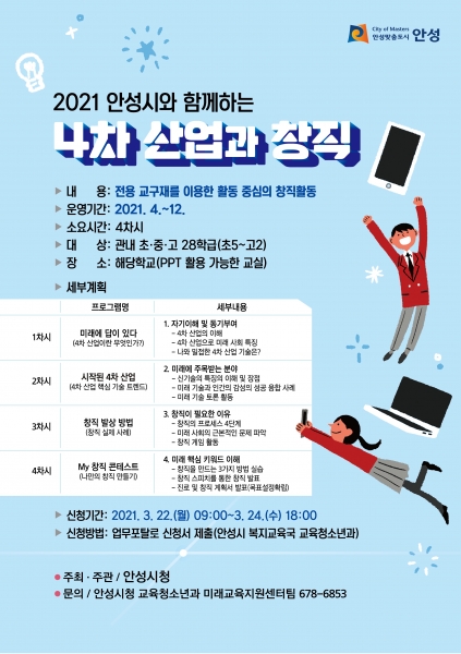 [충청뉴스큐] 안성시는 관내 청소년들이 미래사회를 대비하고 나만의 새로운 직업을 만드는 활동을 통해 창의력 향상과 자기 주도적인 진로설계에 도움이 되고자 ‘안성시와 함께하는 4차 산업과 창직’ 프로그램을 지원한다.