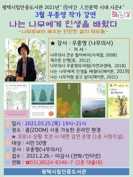 [충청뉴스큐] 평택시립안중도서관은 2021년 3월 야간 인문학 우종영 작가의 ‘나는 나무에게 인생을 배웠다’를 운영한다.